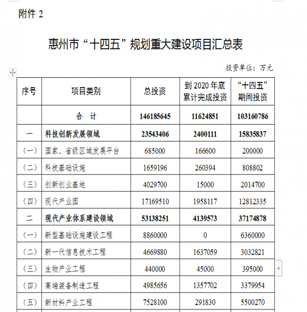 6月3日,惠州市政府正式對(duì)外公布《惠州市國(guó)民經(jīng)濟(jì)和社會(huì)發(fā)展第十四個(gè)五年規(guī)劃和2035年遠(yuǎn)景目標(biāo)綱要》(下稱《綱要》)。其中明確提出,“十四五”期間規(guī)劃建設(shè)重大項(xiàng)目312宗,計(jì)劃總投資近1.5萬(wàn)億元,“十四五”期間計(jì)劃投資10316億元。