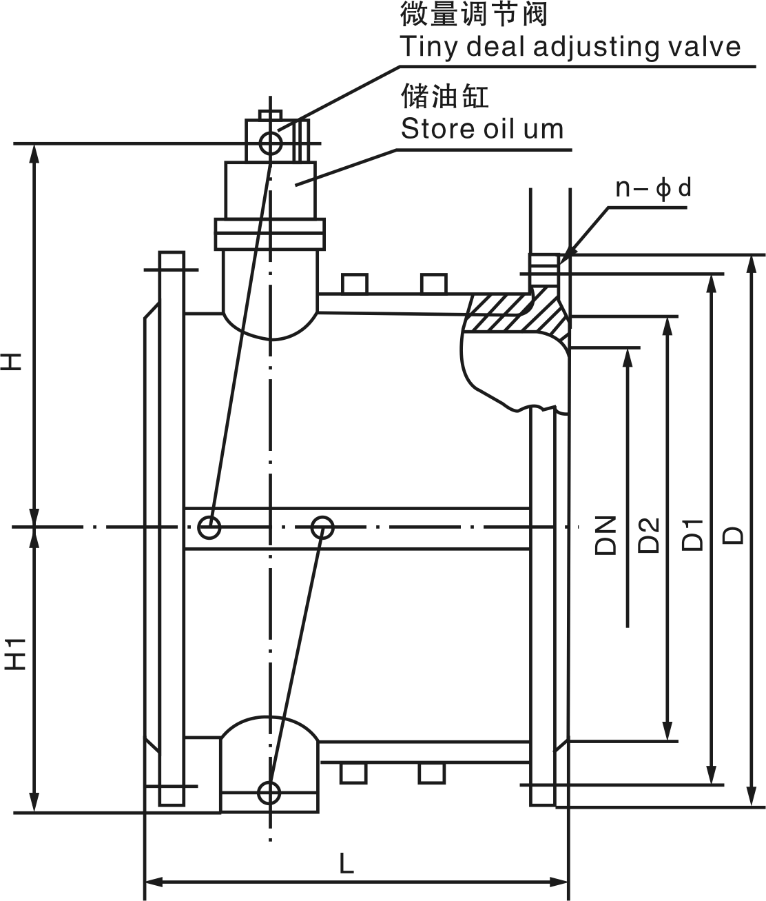 主要由閥體、兩塊半圓閥瓣、回位彈簧、儲油缸、緩閉小氣缸組、針型閥(微量調(diào)節(jié)閥)組成。其原理主要依靠進口介質(zhì)的推力作用,將兩塊閥瓣平穩(wěn)推開。在此同時,進口的壓力介質(zhì)進入油缸內(nèi)活塞的下部,推動活塞,將活塞上部的油通過針型閥分別壓入閥體兩側(cè)的小氣缸尾端,使小氣缸內(nèi)的活塞桿伸出。當(dāng)進口介質(zhì)壓力下降低于出口壓力時,介質(zhì)將產(chǎn)生回流,此時閥瓣在彈簧和介質(zhì)回流的作用下,將自動關(guān)閉。但由于活塞桿處于伸出的位置,頂住閥瓣不能全部關(guān)閉,還剩有20%左右的面積使介質(zhì)通過,從而起到了消除水錘的作用。閥瓣被活塞分成先快速關(guān)閉后緩慢兩步關(guān)閉,達到既防電機逆轉(zhuǎn)又起消除靜音作用。
