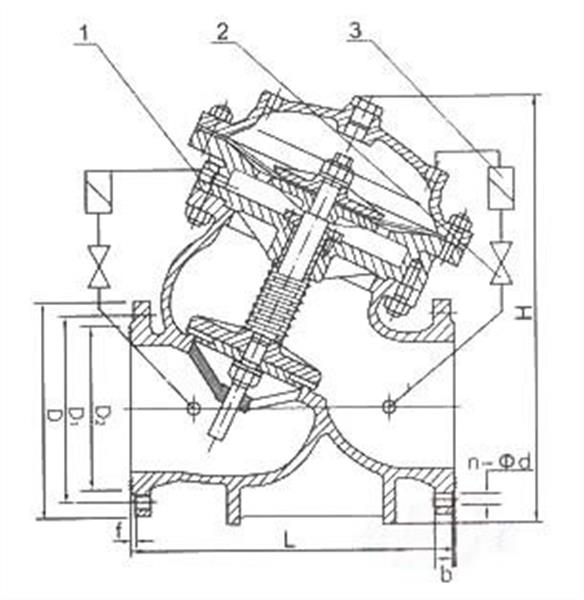 JD745X 多功能水泵控制閥由主閥和調(diào)節(jié)閥及接管系統(tǒng)組成,閥體采用直流式閥體,主閥控制室為膜片式或活塞式的雙控制室結(jié)構(gòu),控制室比一般水力控制閥增加了一個,增加了對主閥的控制功能,實現(xiàn)了對水泵出口的緩慢開啟、全開、緩閉、截止等多功能控制,實現(xiàn)了一個閥門、一次調(diào)節(jié)對水泵出口的多功能控制。本閥門安裝在水泵出口端,順序?qū)崿F(xiàn)緩慢開啟、全開、速閉、緩閉等功能。